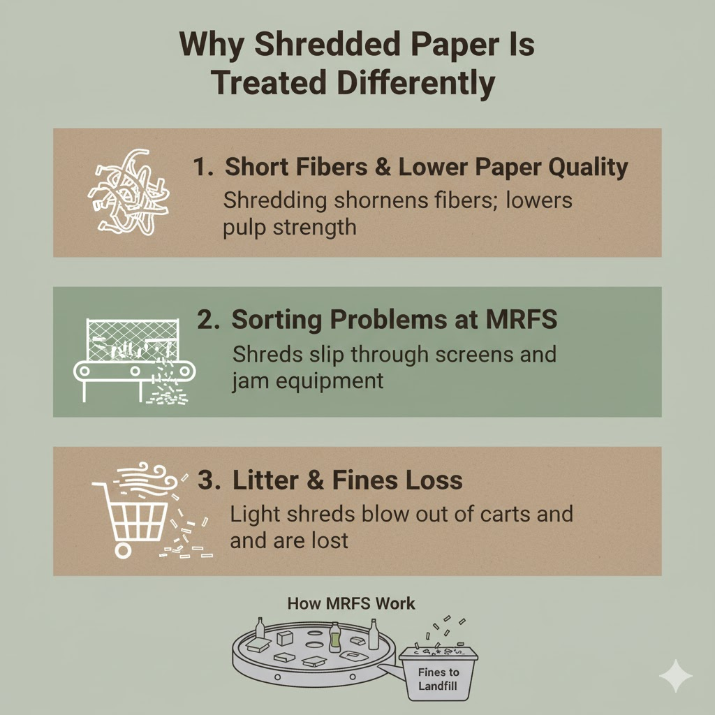 Tiny strips escape screens and fall through “fines,” stick to other materials, or wrap around gears. Many cities therefore exclude loose shreds from mixed recycling because they contaminate other streams and slow equipment.