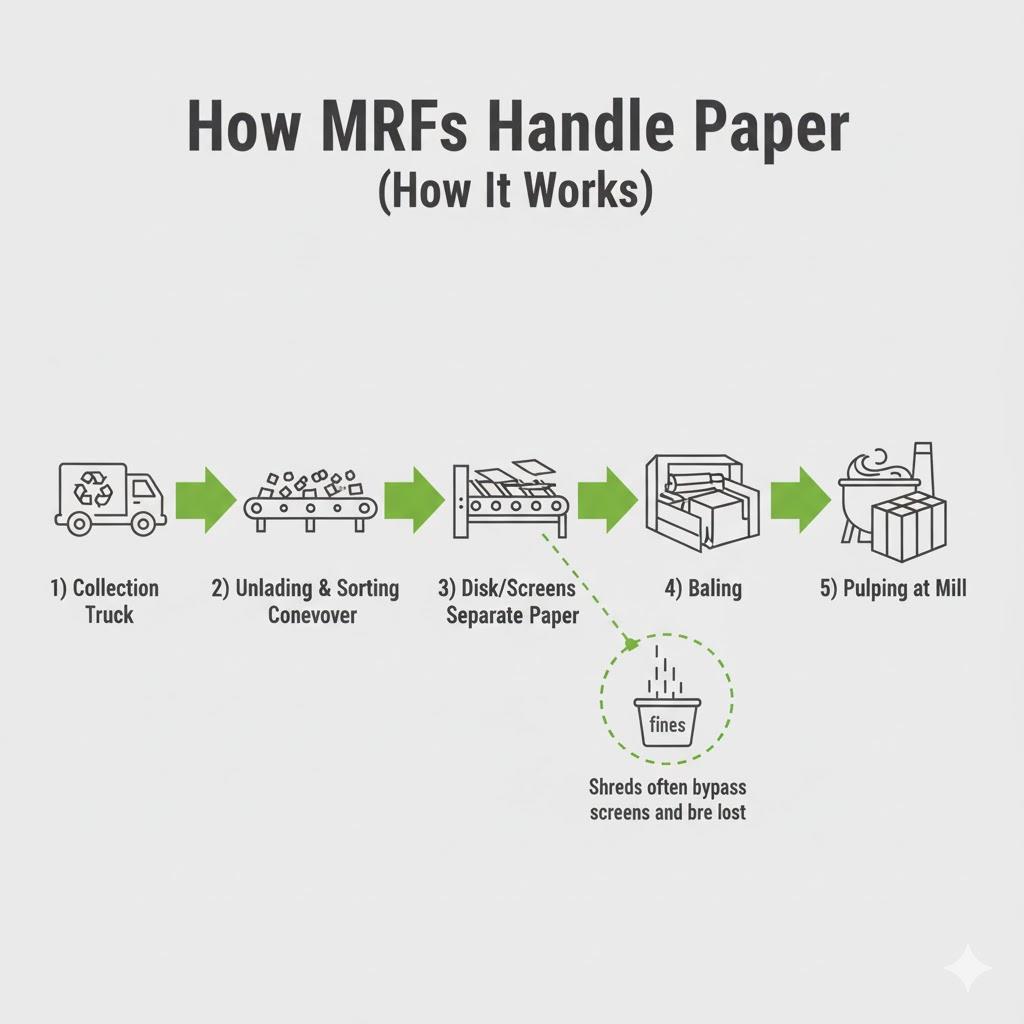 Where allowed, place shreds in a paper bag/box, seal it, and label it so it stays contained through collection and sorting. This simple step reduces mess and helps MRFs capture the material.
