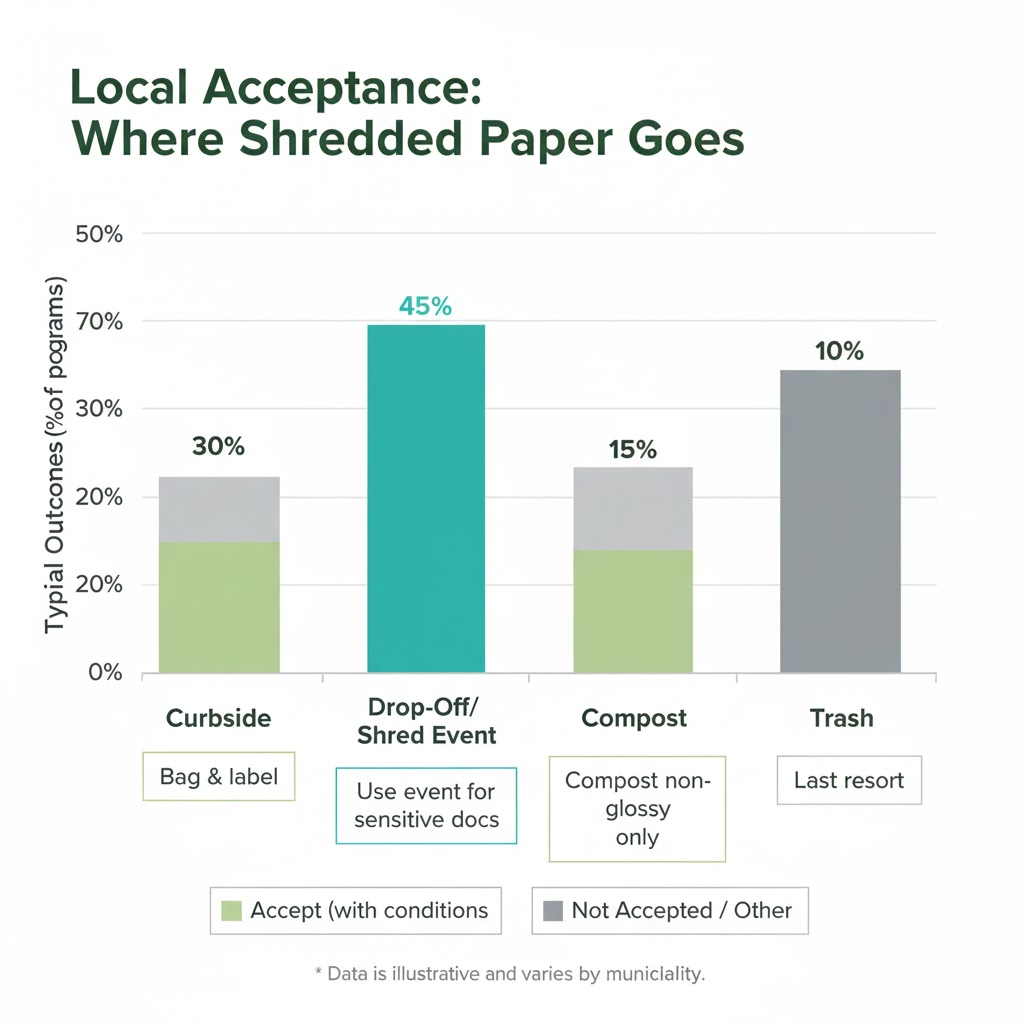 Community events and commercial shredders collect documents separately and send fiber straight to paper mills, bypassing the mixed-recycling MRF where shreds get lost. Cities publish calendars for these events.