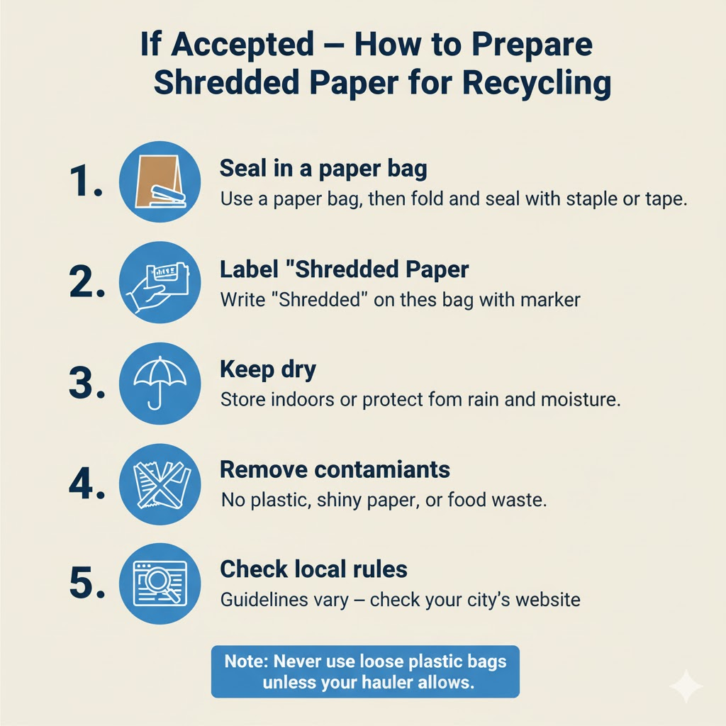 Some programs do accept shreds if you contain them—often in a stapled or taped paper bag, sometimes (in the UK, for example) in a tied carrier bag for the paper stream. Always verify your area’s exact prep rules before you set it out.