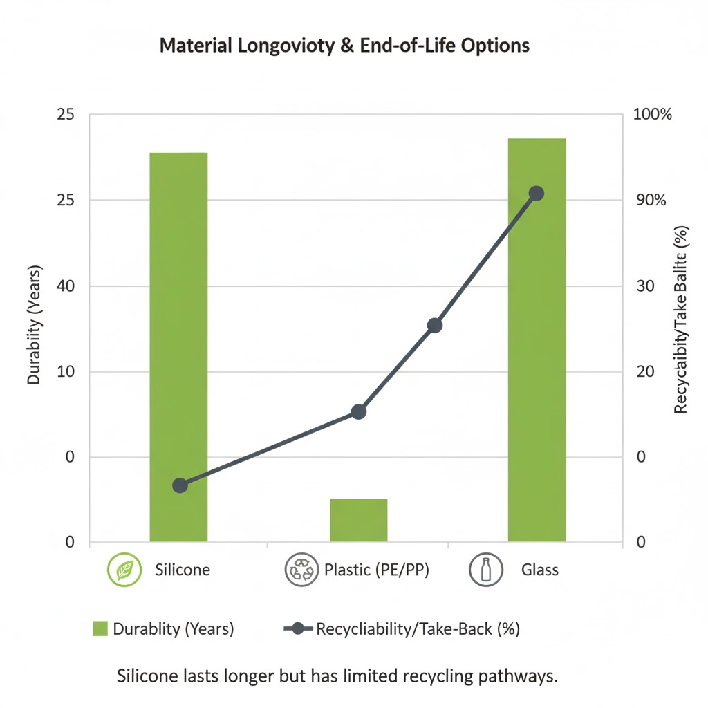 | Material | Heat handling | Durability | Recycling/End-of-life | Notes |