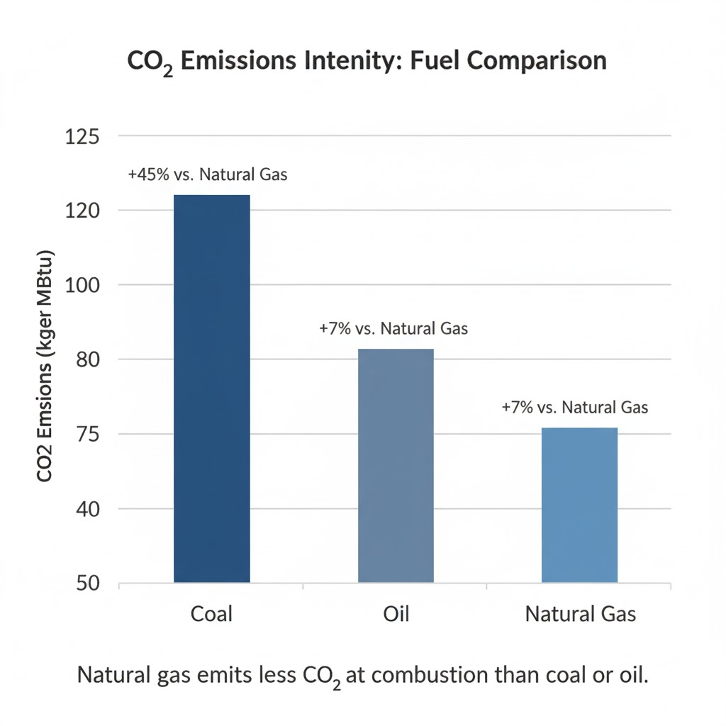 Per unit of energy, gas produces substantially less CO₂ and conventional air pollutants than coal or oil when burned—one reason many grids shifted from coal to gas over the last decade.