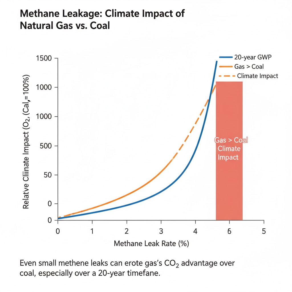The big climate catch is methane: tiny leaks across drilling, processing, pipelines, LNG, and engines can erase much of gas’s CO₂ advantage.