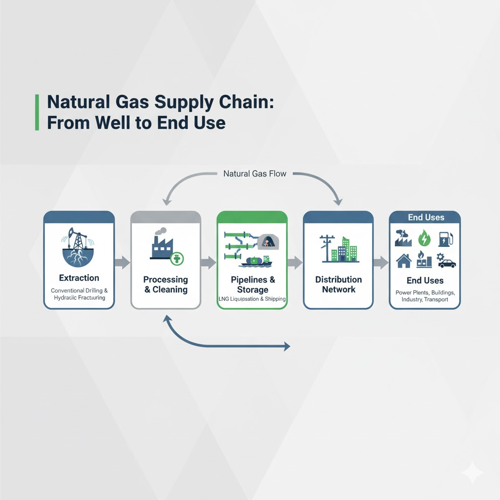 Visual placeholder: [Insert flow diagram] Well → Processing → Pipelines/Storage or LNG → End uses (add alt text describing each step).