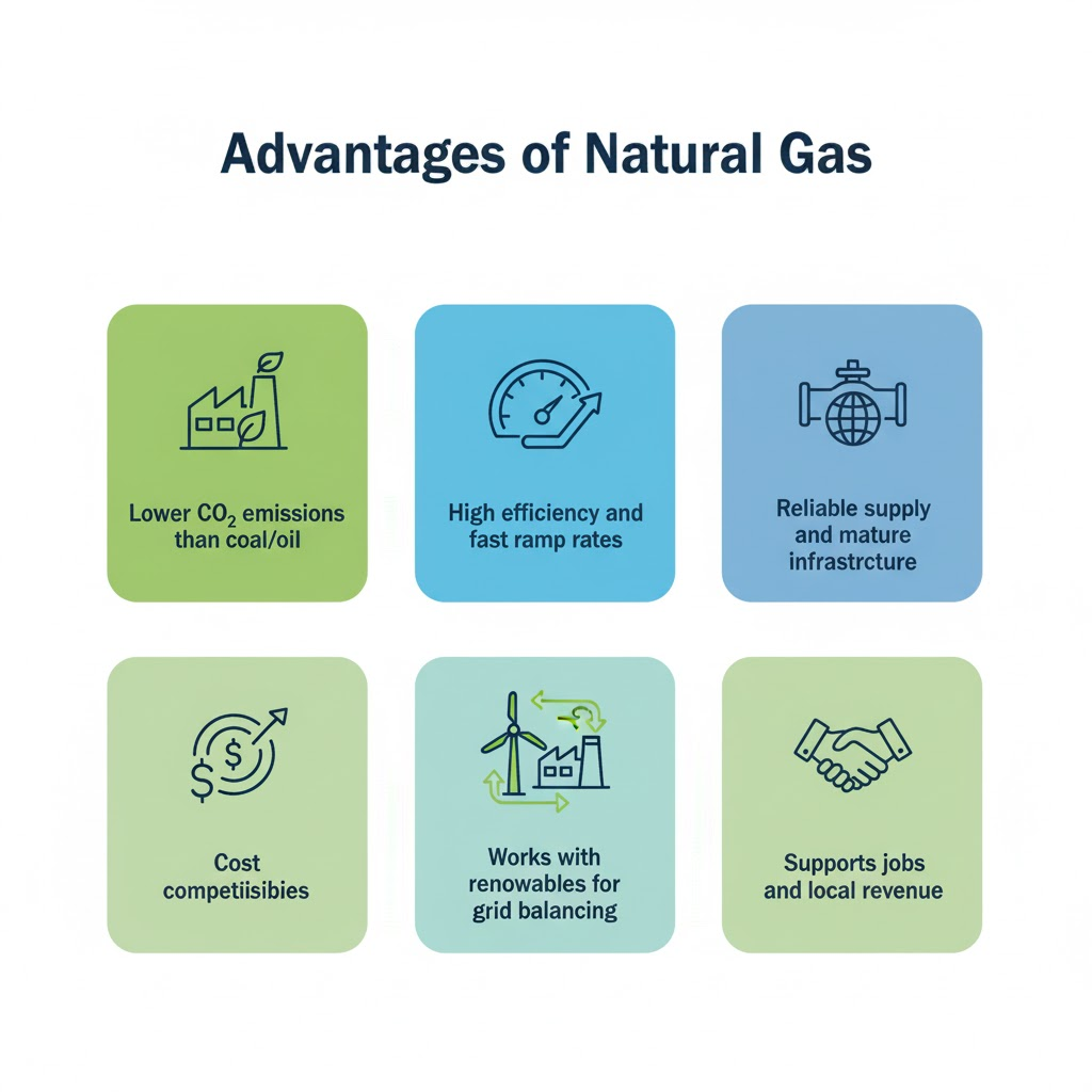 Combined-cycle plants reach high thermal efficiencies, and simple-cycle turbines can start and hit load quickly—useful for keeping the grid stable during heat waves, cold snaps, or sudden dips in wind/solar.