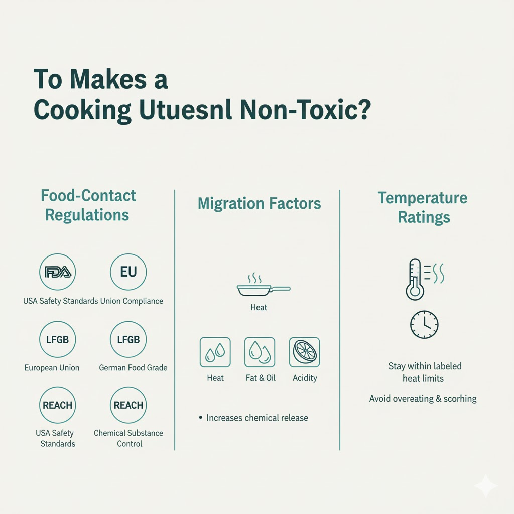 Utensil labels (e.g., “heat-safe to 425°F/220°C”) reflect the conditions the material has been tested to tolerate without excessive migration or deformation. Regulators and labs define test conditions by time, temperature, and food simulants; those ratings aren’t an invitation to push hotter or longer.