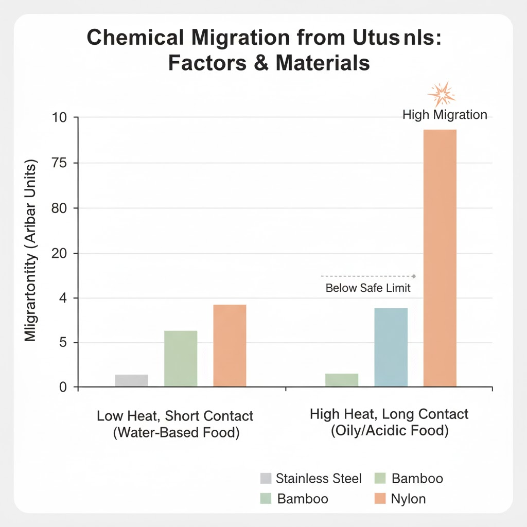 Chemical transfer rises with temperature, contact time, and food “extractiveness” (oily/fatty or acidic). That’s why a cool salad bowl is different from a sizzling skillet. Higher heat and fatty sauces generally drive more migration.