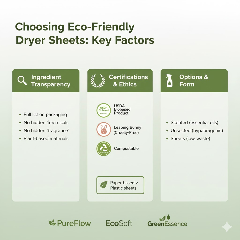 Shortlist criteria: clear ingredients; low-irritant fragrance strategy (or none); credible certifications (biobased, cruelty-free/vegan, compostable paper where relevant); and real-world performance/static control. We also cross-reference third-party frameworks used by consumer guides for additional context.