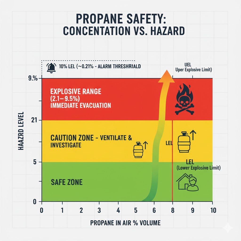 • 10% LEL: A safety threshold used by alarms; for propane that’s ~0.21% propane in air.