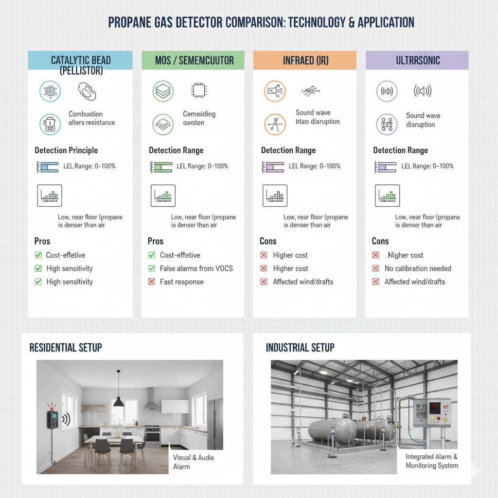 How it works (simple): Detectors sample the air near potential leak points. When propane reaches the device’s set threshold (often referenced to %LEL), it triggers an audible/visual alarm and, in some systems, ventilation or equipment shutdown.