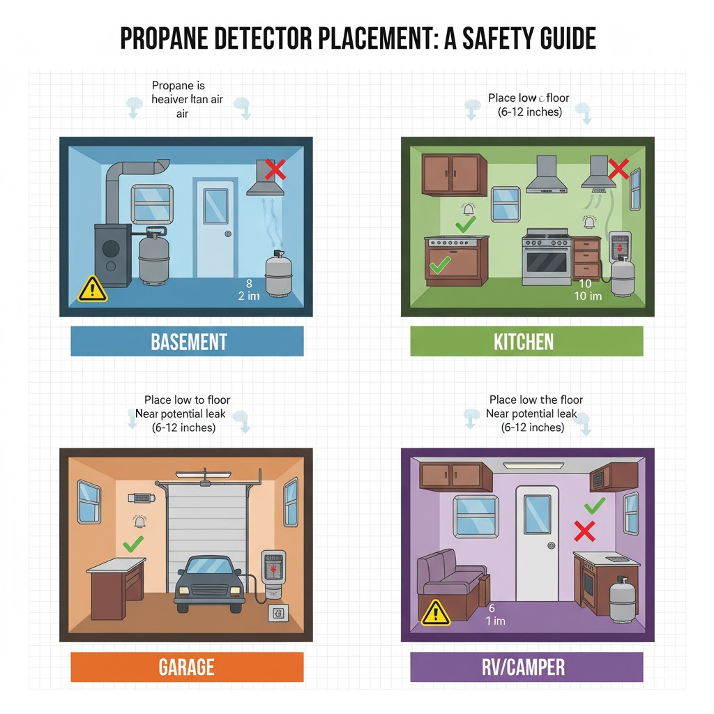 Install propane detectors near the floor (often within 6–12 inches of the finished floor) or per the manufacturer’s instructions; avoid corners or dead-air pockets where gas may not circulate.