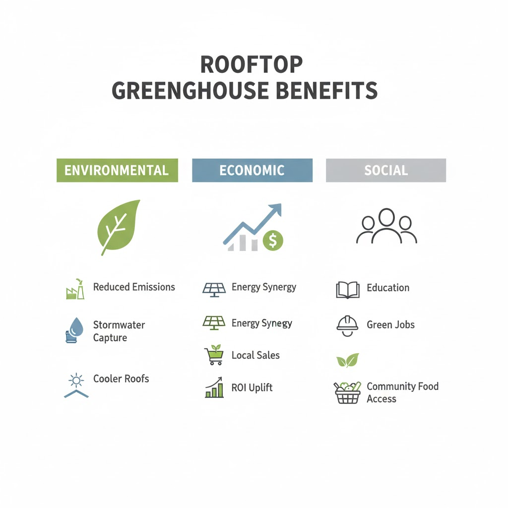 Environmental—Reduced Food Miles, Lower Emissions, Stormwater Management, Urban Heat Island Mitigation, Air Quality