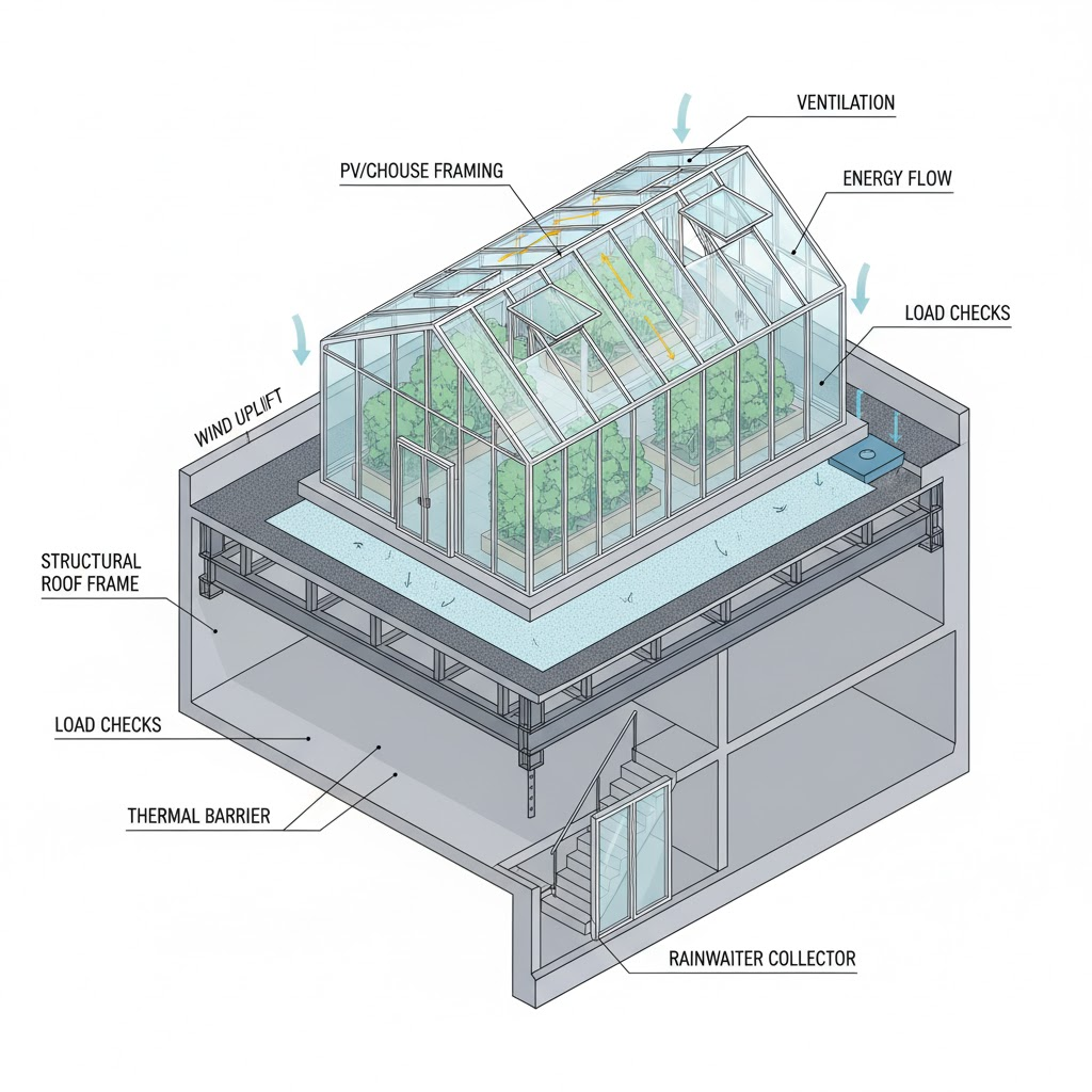 Roofs must be checked for dead/live loads from framing, glazing, water, crops, equipment, and snow; lateral systems must address wind uplift and, in seismic zones, bracing and connections that accommodate drift. Engineering bodies highlight load increases from rooftop assemblies and the need for secure tie-downs/curbs for rooftop structures.